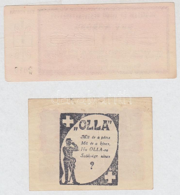 Beschreibung: Székesfehérvár 1920. 1K "Világítási és Vízmű Részvénytársaság" utalvány + Osztrák-Magyar Bank 1922. 1K "Olla" reklám pecséttel a hátoldalán T:I-,III