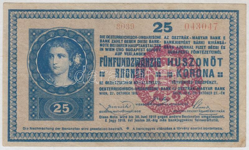 1918. 25K "3039" 3mm, sima hátlappal, hamis piros "MAGY... https://www.darabanth.com/de/262-Fernauktion/262.0/Numismatik/Ungarische-Banknoten~200008/1918-25K-3039-3mm-sima-hatlappal-hamis-piros-MAGYARORSZAG-korbelyegzovel-fake-overprin~II1302616