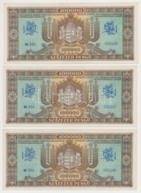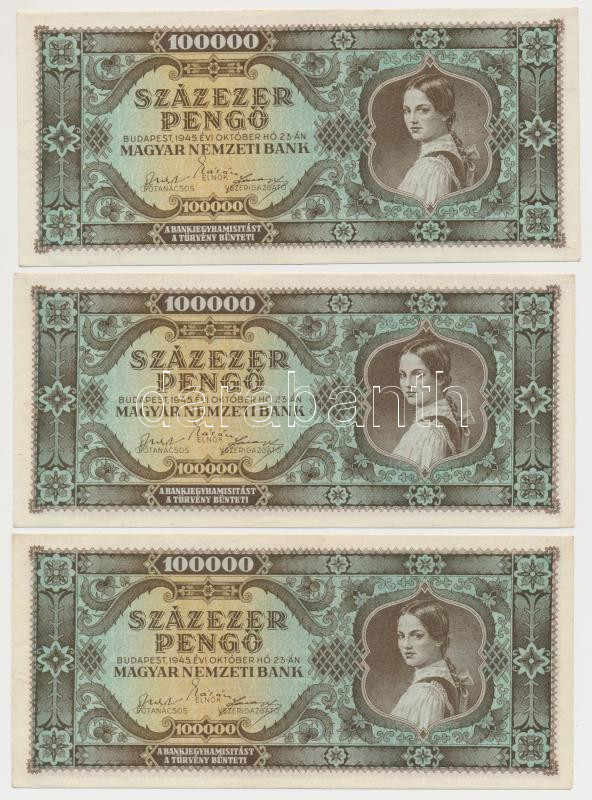1945. 100.000P (3x) sorszámkövetők T:I- https://www.darabanth.com/de/262-Fernauktion/262.0/Numismatik/Ungarische-Banknoten~200008/1945-100000P-3x-sorszamkovetok-TI-~II1305203
