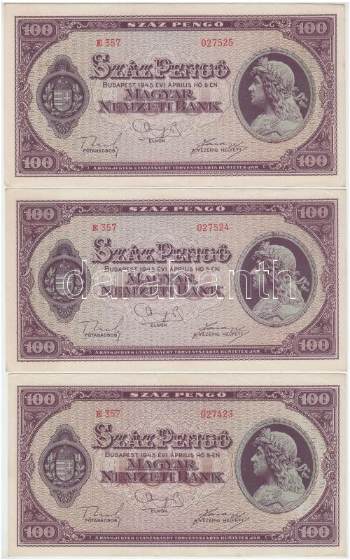 Beschreibung: 1945. 100P (3x) sorszámkövetők, "BÜNTETÉS" szóban "N" felett lemezhiba T:II szép papír