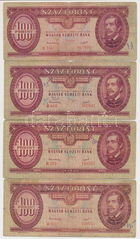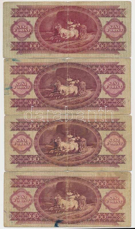 1949. 100Ft (4x) T:III,III- https://www.darabanth.com/de/262-Fernauktion/262.0/Numismatik/Ungarische-Banknoten~200008/1949-100Ft-4x-TIII-III-~II1303476