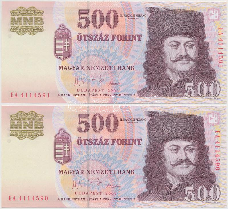 2006. 500Ft "EA" (2x) sorszámkövetők T:I https://www.darabanth.com/de/262-Fernauktion/262.0/Numismatik/Ungarische-Banknoten~200008/2006-500Ft-EA-2x-sorszamkovetok-TI~II1305660