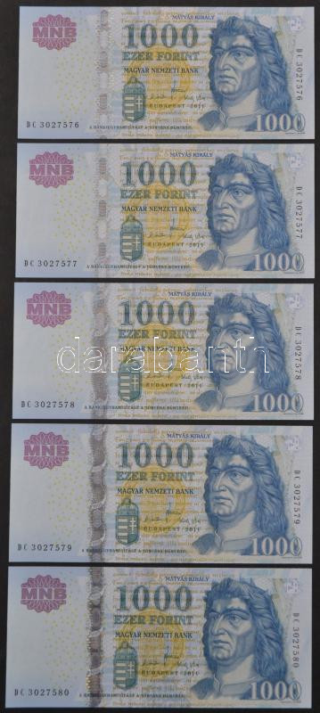 2011. 1000Ft "DC" (5x) sorszámkövetők T:I https://www.darabanth.com/de/262-Fernauktion/262.0/Numismatik/Ungarische-Banknoten~200008/2011-1000Ft-DC-5x-sorszamkovetok-TI~II1305693