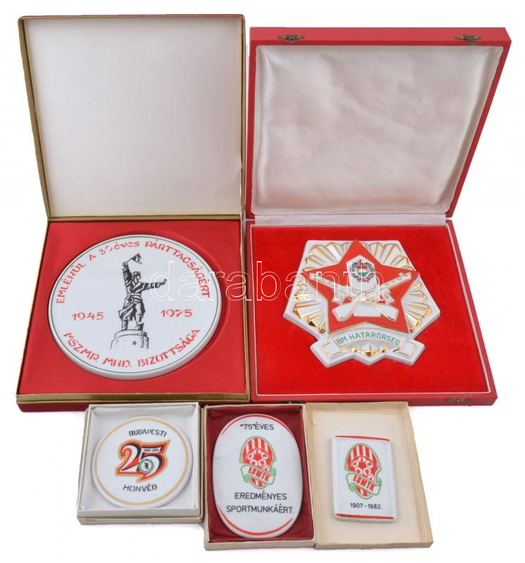 Beschreibung: 5db-os szocialista hollóházi porcelán plakett tétel, közte "BM (Belügyminisztérium) Határőrség", 1974. "Budapesti Honvéd 1949-1974" T:1-2
