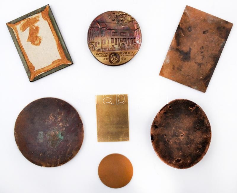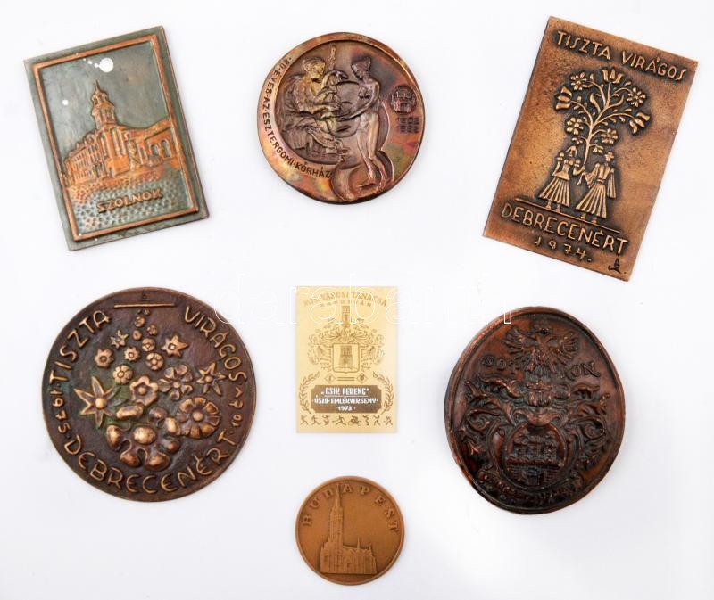 Beschreibung: 7db klf emlékérem, plakett, közte 1975. "Tiszta Virágos Debrecenért - 1975 10 év" jelzett Br plakett (118mm), DN "Sopron" kerémia plakett (115x97mm) T:2,2-