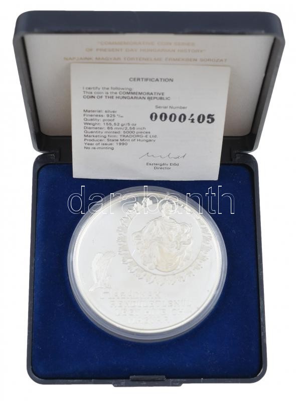 Beschreibung: Bognár György (1944-) 1990. "Magyar Köztársaság 1956-1989. Október 23. / Hazádnak rendületlenül légy híve, oh magyar;" piefort Ag emlékérem dísztokban, tanúsítvánnyal (156,91g/0.925/65mm) T:PP ujjlenyomatos, felületi karc