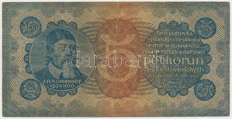 Czechoslovakia 1921. 5 Korun C:F https://www.darabanth.com/de/262-Fernauktion/262.0/Numismatik/Weltweit-Banknoten~200013/Csehszlovakia-1921-5K-TIII--Czechoslovakia-1921-5-Korun-CF~II1304459