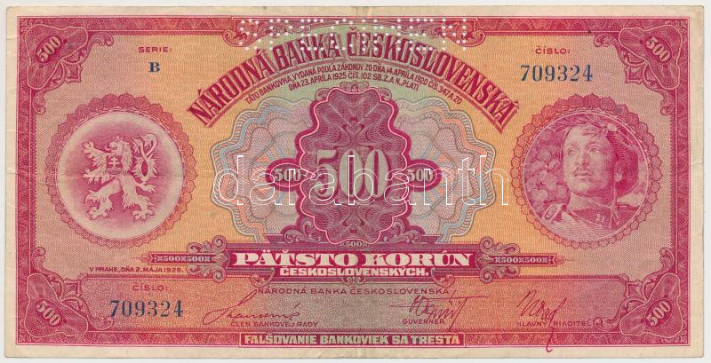 Czechoslovakia 1929. 500 Korun perforated "SPECIMEN" C:F gluemark
