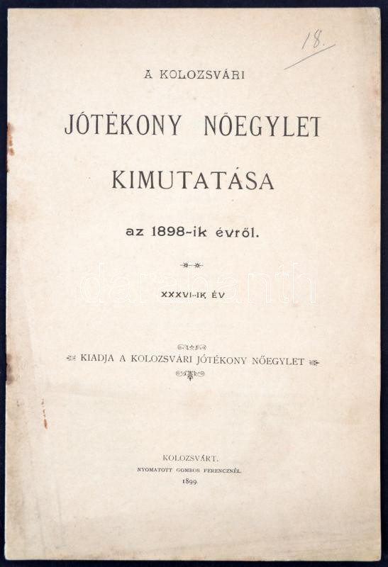 1899 A Kolozsvári Jótékony Nőegylet kimutatása, pp.:18, 22x15cm https://www.darabanth.com/de/263-Fernauktion/263.0/Andere-Sammelgebiete/Drucksachen~12/1899-A-Kolozsvari-Jotekony-Noegylet-kimutatasa-pp18-22x15cm~II1309742
