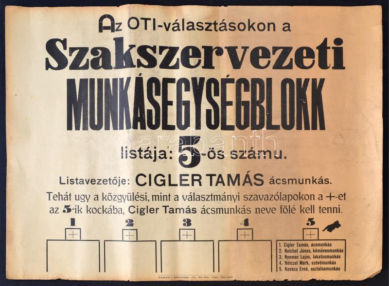 A Szakszervezeti Munkássegélyblokk nagyméretű OTI-választás plakátja, ... https://www.darabanth.com/de/263-Fernauktion/263.0/Andere-Sammelgebiete/Drucksachen~12/A-Szakszervezeti-Munkassegelyblokk-nagymeretu-OTI-valasztas-plakatja-szakadassal-47x62-cm~II1308619
