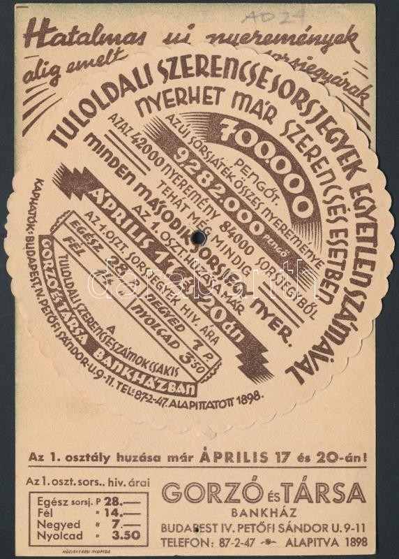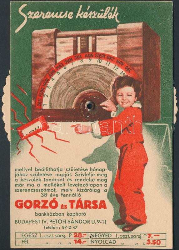 cca 1930 Gorzó és társa bankház szerencsesorsjegy mechanikus reklámlap... https://www.darabanth.com/de/263-Fernauktion/263.0/Andere-Sammelgebiete/Drucksachen~12/cca-1930-Gorzo-es-tarsa-bankhaz-szerencsesorsjegy-mechanikus-reklamlap-Forgathato-szerencse-k~II1309990