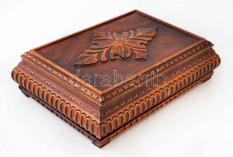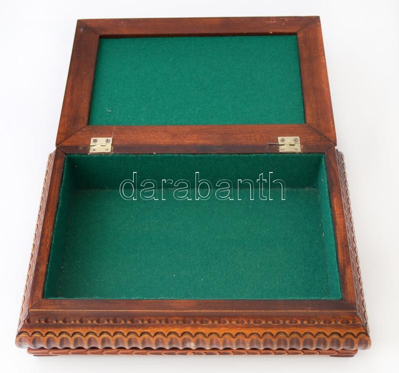 Faragott fa doboz, belül posztó béléssel, szép állapotban, 27x20x8 cm https://www.darabanth.com/de/263-Fernauktion/263.0/Andere-Sammelgebiete/Flohmarkt~15/Faragott-fa-doboz-belul-poszto-belessel-szep-allapotban-27x20x8-cm~II1311663