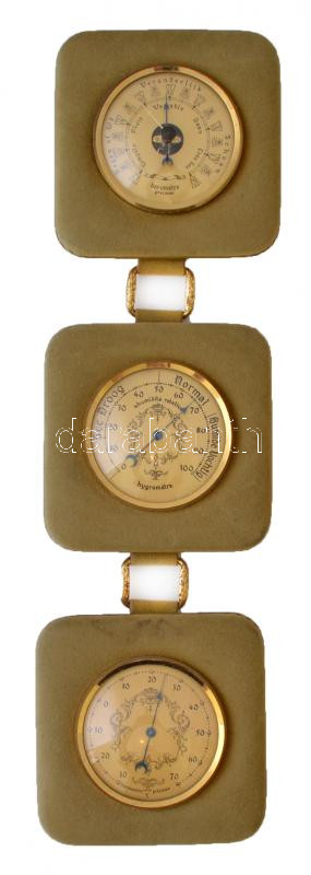 Beschreibung: Háromrészes fali barométer, velúrborítású táblákon. Az egyik kijelző üvege repedt. h: 38 cm, a kijelző üveg átmérője 7 cm.