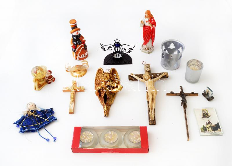Beschreibung: Vegyes karácsonyi, vallási tétel, benne: feszület, aranyszínű puttók, hóember figura, Jézus figura, stb.