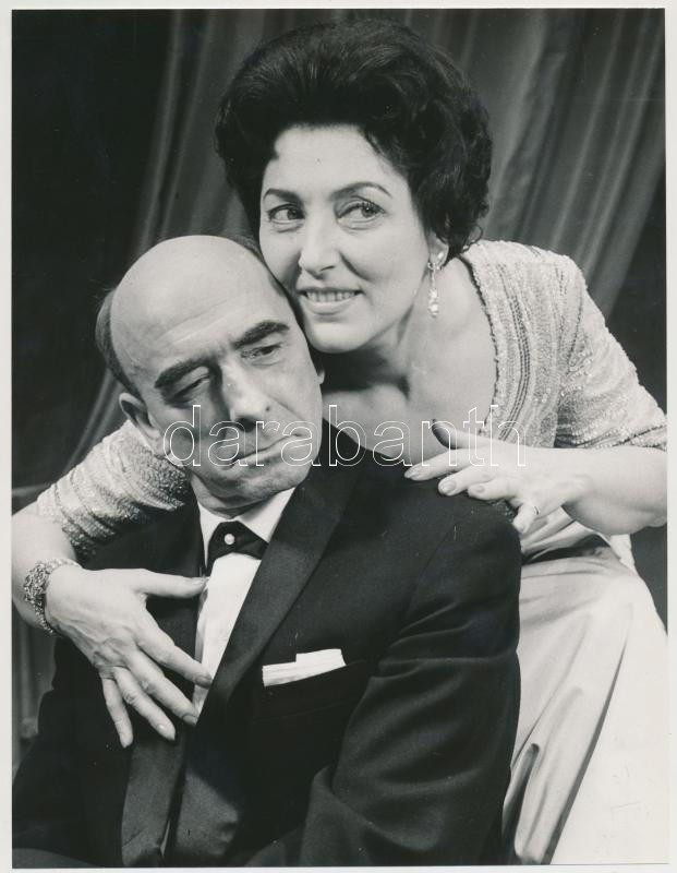 Beschreibung: cca 1963 Lukács Margit (1914-) színésznő Major Tamást (1910-1986) bűvöli a színpadon, a Kedves hazug c. darabban, vintage fotó, 23x17,5 cm