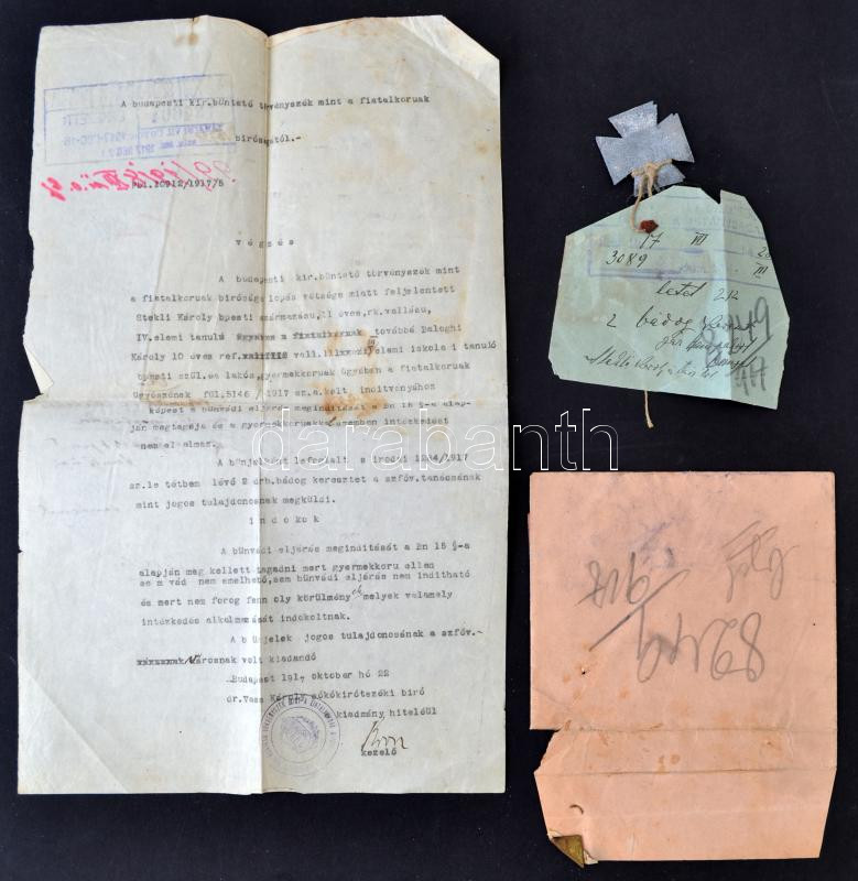 1917 A budapesti kir. büntető törvényszék végzése arról, hogy gyermekkorúakkal szemben eljárást nem indít és a bűnjelként lefoglalt bádogkeresztet a tulajdonosnak megküldi, mellékelve
