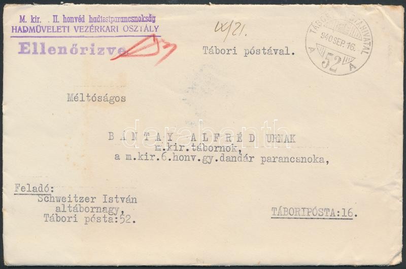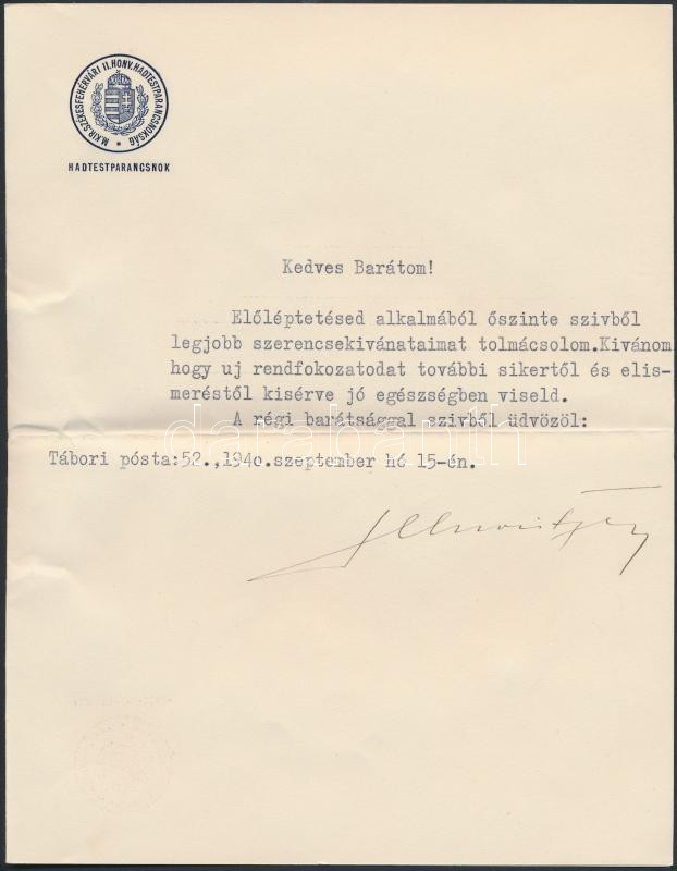 1940 A M. Kir. II. Honv. Hadtestparancsnokság hadműveleti vezérkari osztályának főnöke, Schweitzer István által Bántay Alfrédnak küldött gratuláló levél kinevezése alkalmából, aláírva