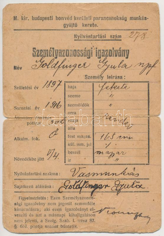 cca 1916 A M. kir. budapesti honvéd kerületi parancsnokság munkásgyűjtő kerete által kiállított személyazonossági igazolvány feltehetőleg izraelita vallású egyén számára