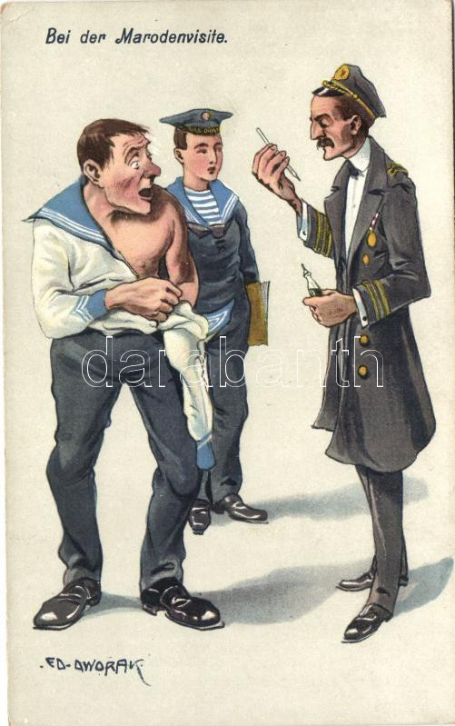 'Bei der Marodenvisite' / K.u.K. Mariner visited by medical doctor, hu... https://www.darabanth.com/de/263-Fernauktion/263.0/Ansichtskarten/Kriegsschiffe~100073/Bei-der-Marodenvisite-KuK-Mariner-visited-by-medical-doctor-humour-s-Ed-Dworak-EK~II1311568