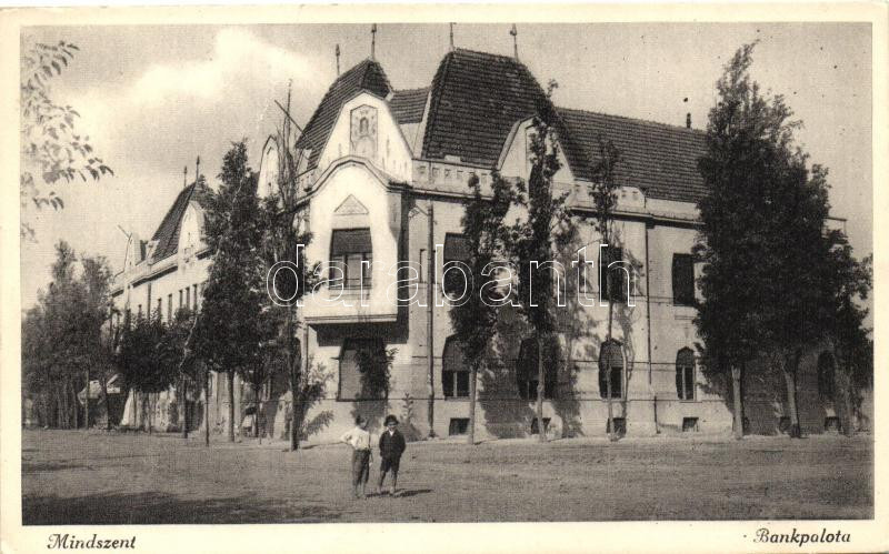 Beschreibung: Mindszent, Bankpalota, kiadja a Horváth Antalné könyv- és papírkereskedés (fa)