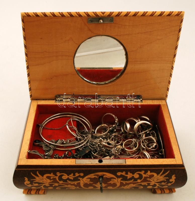 Vegyes nemesfém tétel: ezüst (Ag.) ékszerek: karkötők, gyűrűk, fülbevalók, stb., egy részük berakásokkal, jelzettek, intarziás zenélő fa dobozban, bruttó 225 g