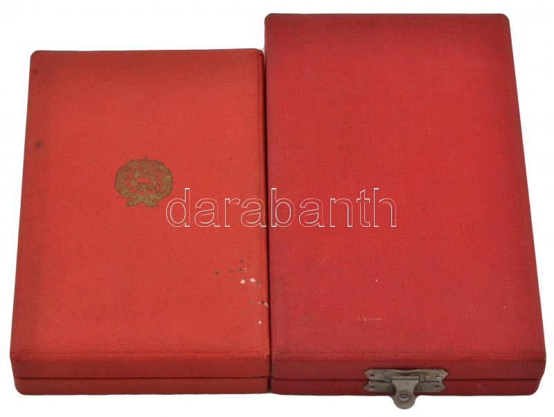 Beschreibung: 1951. "Közbiztonsági Érem" ezüst fokozata a rendőrség tagjai részére, zománcozott kitüntetés mellszalagon, szalagsávval + 1966. "Szocialista Hazáért Érdemrend" zománcozott Br kitüntetés mellszalaggal, szalagsávval és miniatűrrel dísztokban T:2