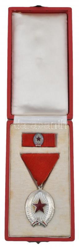 Beschreibung: 1964. "Munka Érdemrend" ezüst fokozata, zománcozott Br kitüntetés miniatűrrel szalagsávon, eredeti tokban T:2