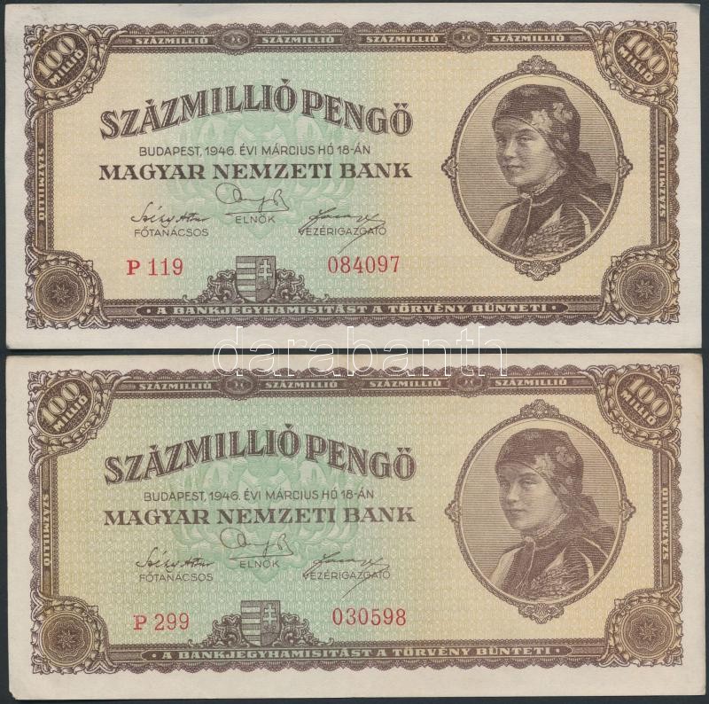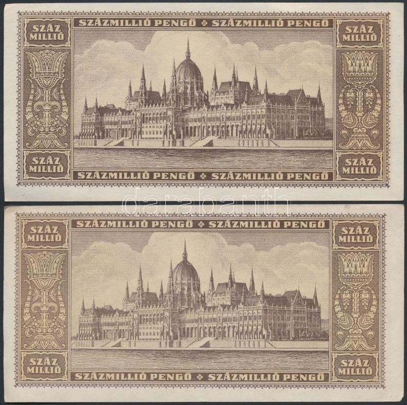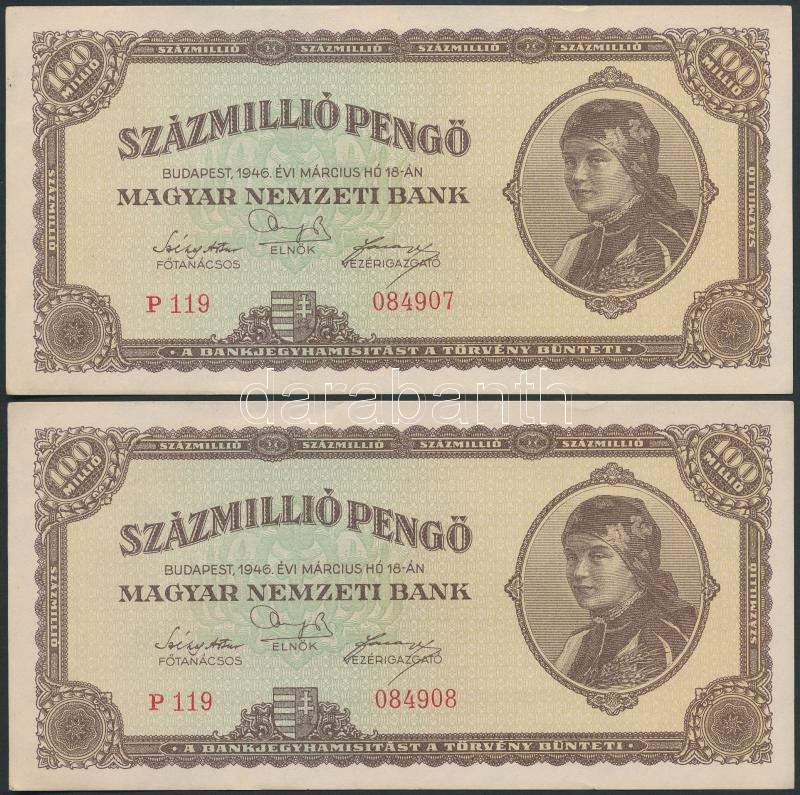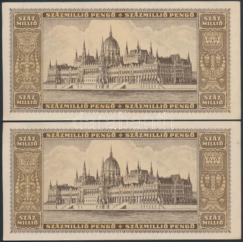 1946. 100.000.000P (4x) párban sorszámkövetők T:I,I- https://www.darabanth.com/de/263-Fernauktion/263.0/Numismatik/Ungarische-Banknoten~300007/1946-100000000P-4x-parban-sorszamkovetok-TI-I-~II1310613