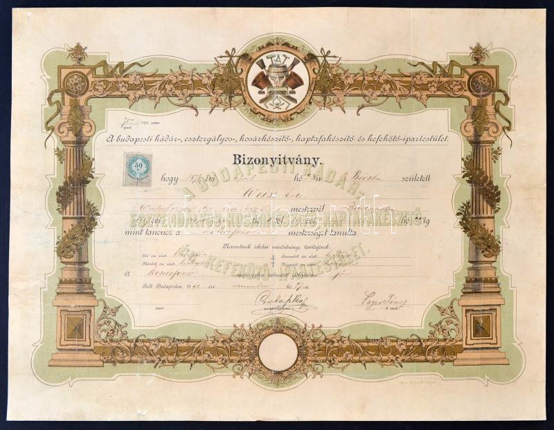 1874 Bizonyítvány kosárfonó mesterség elsajátításról, Budapest, okmány... https://www.darabanth.com/de/264-Fernauktion/264.0/Andere-Sammelgebiete/Dokument~15/1874-Bizonyitvany-kosarfono-mesterseg-elsajatitasrol-Budapest-okmanybelyeggel-50kr-~II1320139
