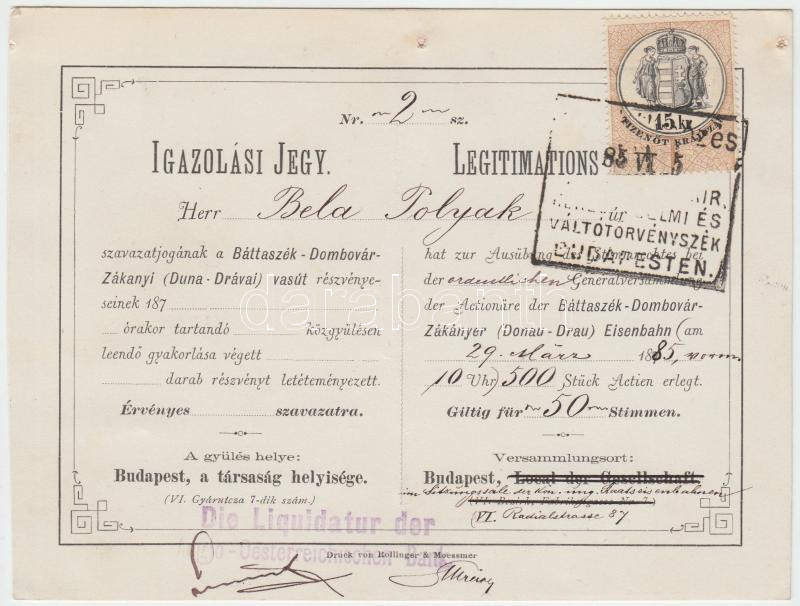 Beschreibung: 1885 Igazolási Jegy a Báttaszék-DombóvárZákanyi vasút részvényeseinek, okmánybélyeggel, 12x16cm