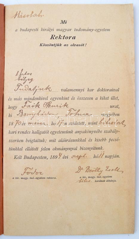 1897 Bölcsészhallgató leckekönyvének utólagos másolata. https://www.darabanth.com/de/264-Fernauktion/264.0/Andere-Sammelgebiete/Dokument~15/1897-Bolcseszhallgato-leckekonyvenek-utolagos-masolata~II1315293