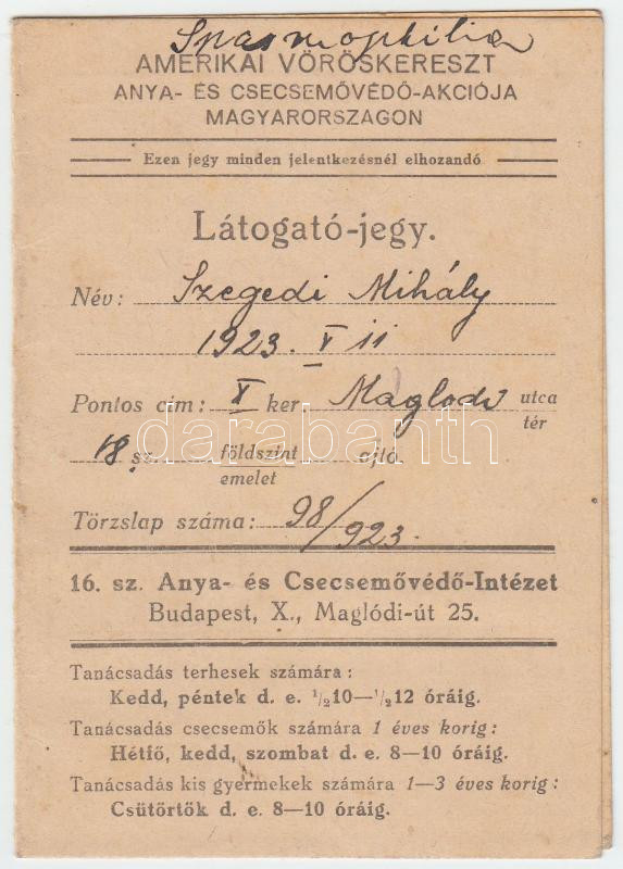 1923 Látogató-jegy, Amerikai Vöröskereszt Anya- és Csecsemővédő-akciój... https://www.darabanth.com/de/264-Fernauktion/264.0/Andere-Sammelgebiete/Dokument~15/1923-Latogato-jegy-Amerikai-Voroskereszt-Anya-es-Csecsemovedo-akcioja-Magyarorszagon-12~II1319673