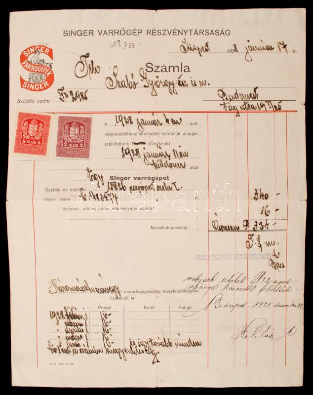 1928 Bp., A Singer Varrógép Részvénytársaság fejléces számlája ellenőr... https://www.darabanth.com/de/264-Fernauktion/264.0/Andere-Sammelgebiete/Dokument~15/1928-Bp-A-Singer-Varrogep-Reszvenytarsasag-fejleces-szamlaja-ellenorzesi-szelvennyel-~II1314707
