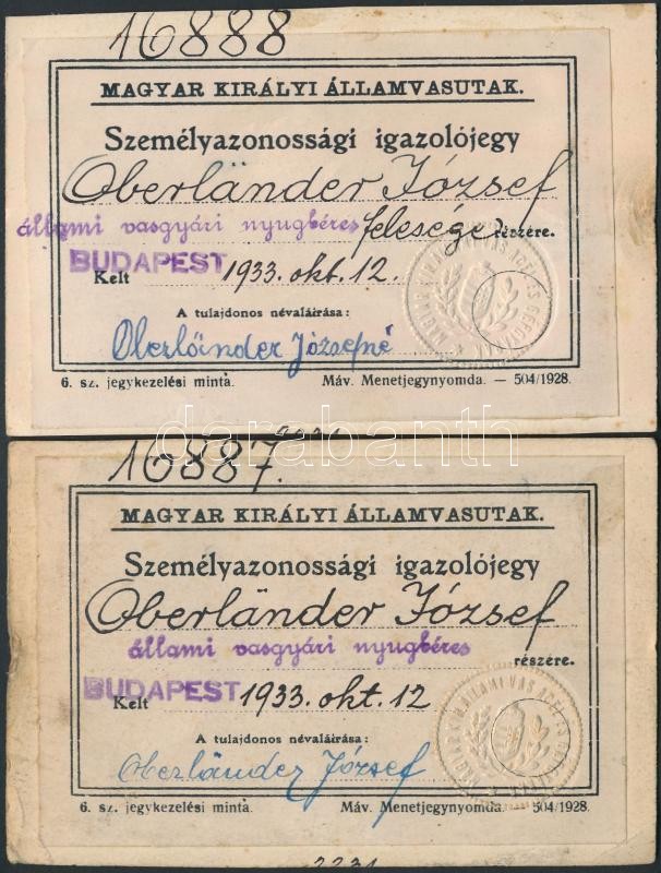 Beschreibung: 1933 Magyar Királyi Államvasutak fényképes személyazonossági igazolójegy, 2 db