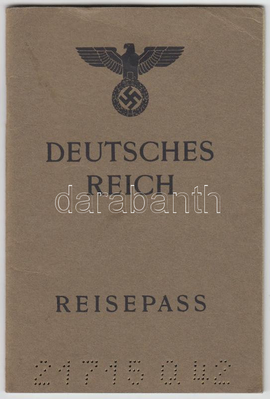 1942 Deutsches Reich reisepass, Német Birodalmi útlevél, pp.:32, 16x11... https://www.darabanth.com/de/264-Fernauktion/264.0/Andere-Sammelgebiete/Dokument~15/1942-Deutsches-Reich-reisepass-Nemet-Birodalmi-utlevel-pp32-16x11cm~II1320184