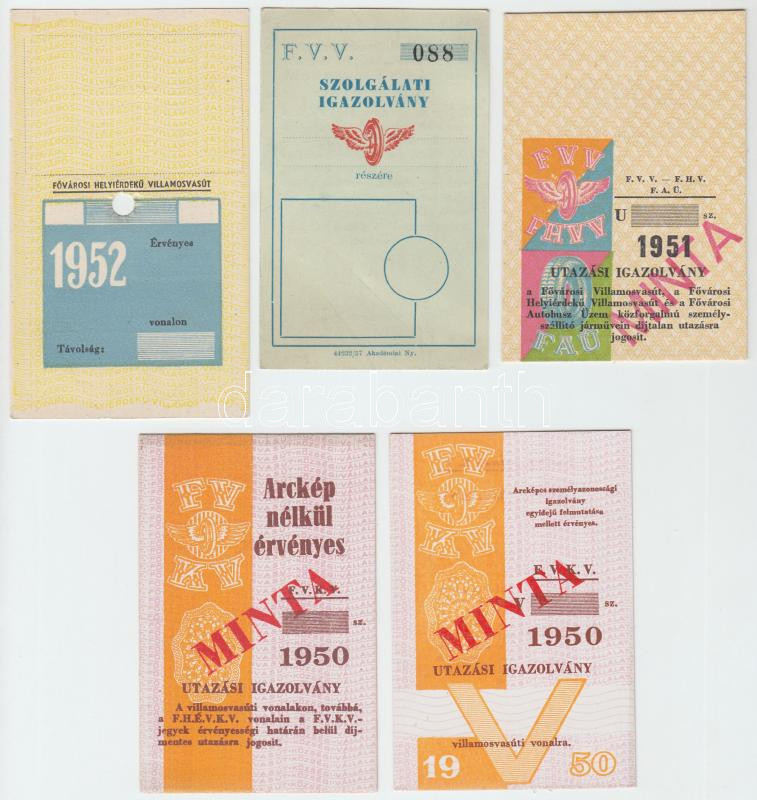 Beschreibung: 1950-1952 Budapest, HÉV és villamos bérletminták, 1 db szolgálati igazolvány, összesen 5 db