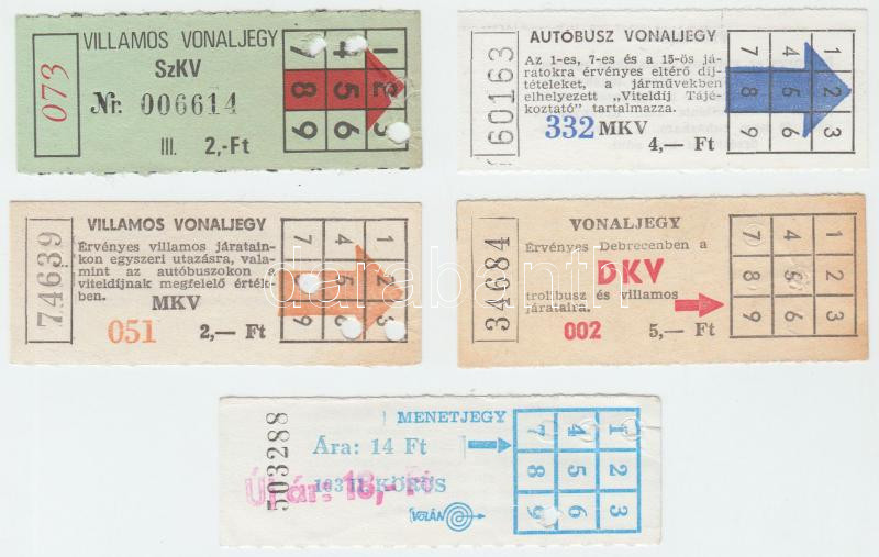 Beschreibung: Miskolci, szegedi, debreceni közlekedési jegyek, 5 db