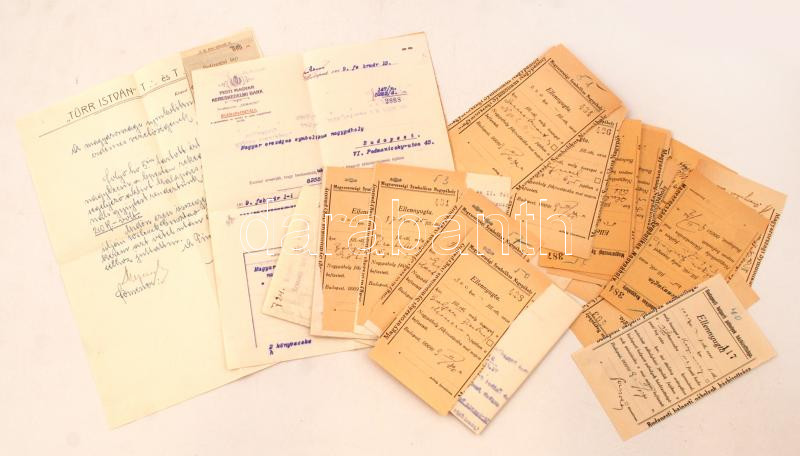 Beschreibung: 1919 Magyarországi Symbolikus Nagypáholy okmányai: benne ellennyugták, hivatalos levelek, min. 20db