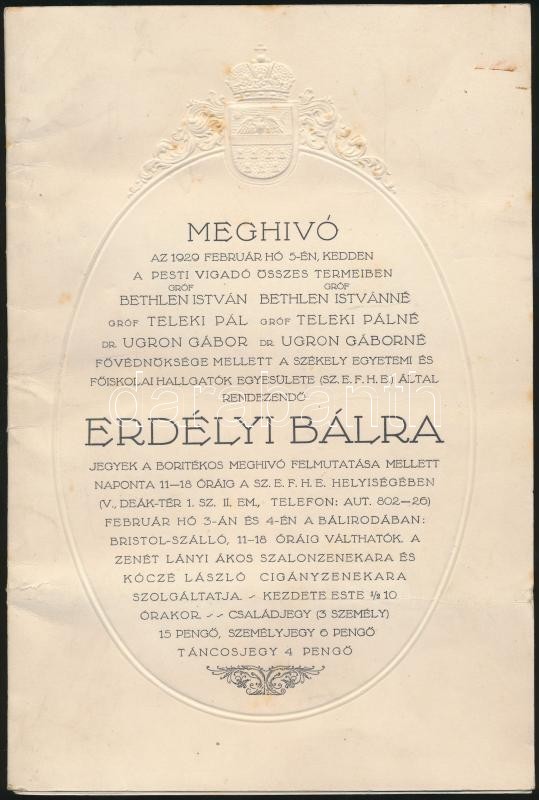 1929 Székely Egyetemi és Főiskolai Hallgatók Erdélyi bálra szóló meghívója, dombornyomott erdélyi címerrel, valamint hozzá tartozó táncrend / 1929 Transylvanian ball invitation card and dance-schedule