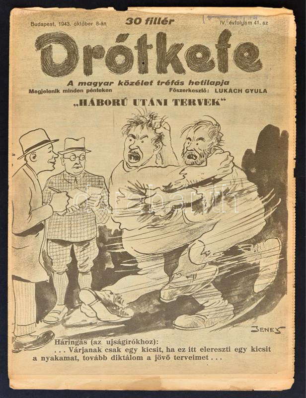 1943 Bp., A Drótkefe, A magyar közélet tréfás hetilapja IV. évfolyam 4... https://www.darabanth.com/de/264-Fernauktion/264.0/Andere-Sammelgebiete/Drucksachen~25/1943-Bp-A-Drotkefe-A-magyar-kozelet-trefas-hetilapja-IV-evfolyam-41-szam-8p~II1319534
