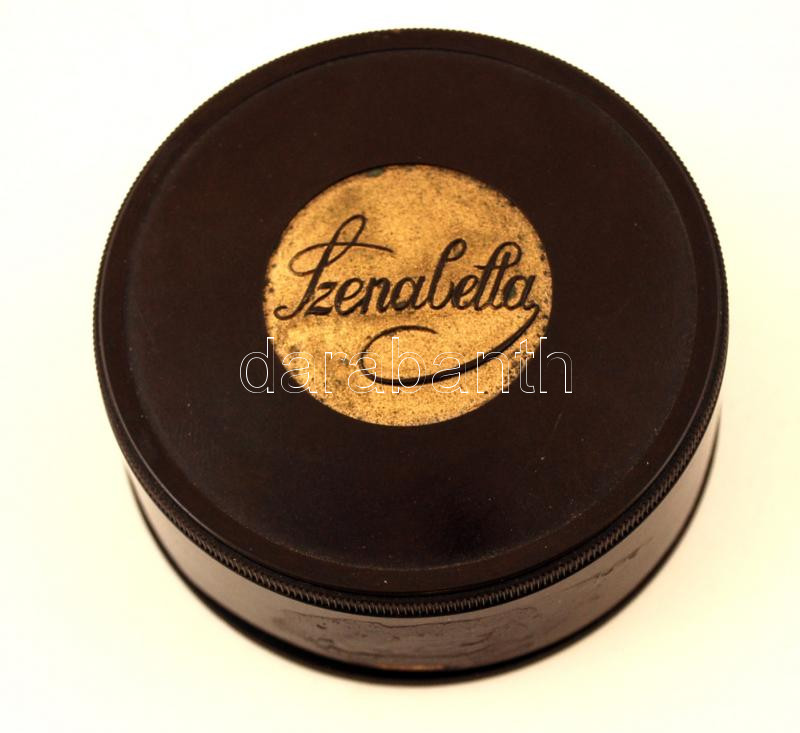 Beschreibung: Szenabella (Szénási Béla kereskedő) bakelit doboz, d: 6,5 cm, m: 2,5 cm