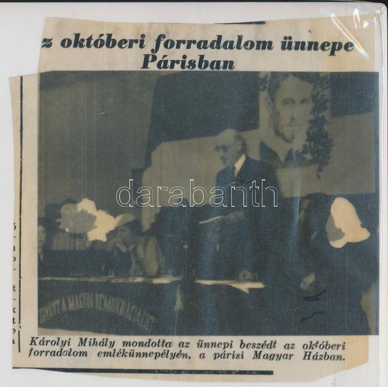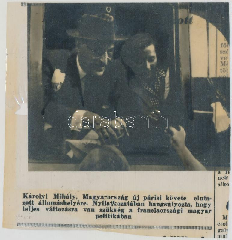 1947 Károlyi Mihály a Magyar Köztársaság párizsi nagykövete, 3 db nyomdatechnikai filmen levő diapozitív riportkép a hozzárendelt szöveggel, 8x9 cm és 10x14 cm közötti méretekben
