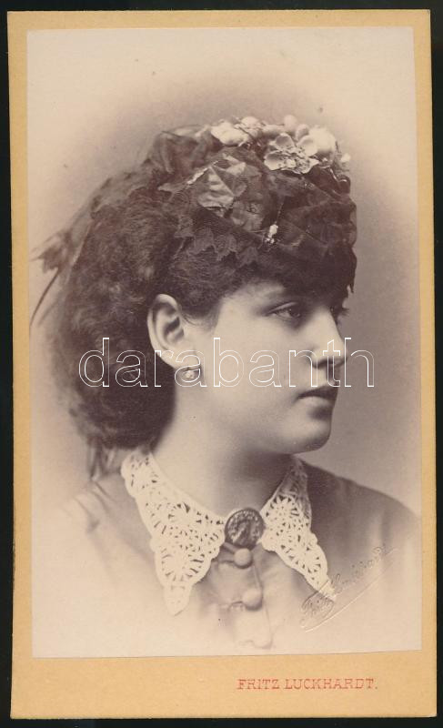 Beschreibung: Pulitzer Gézáné, Caroline Finaly (1849-1934) operaénekes, szoprán, keményhátú kabinetfotó Fritz Luckhardt műterméből, 10x60cm