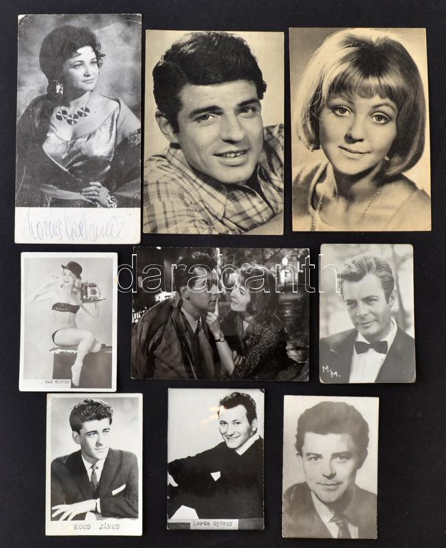 Beschreibung: Vegyes színész és énekes fotó és nyomtatvány, benne Törőcsik Mari, Latinovits Zoltán, Kovács Apollónia (aláírt), 9db, stb., különböző méretben és minőségben