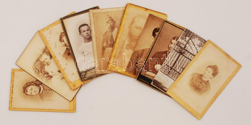 Beschreibung: cca 1860-1900 Vegyes keményhátú kabinetfotók magyar és külföldi műtermekből, 10 db különböző állapotban, 10x6cm