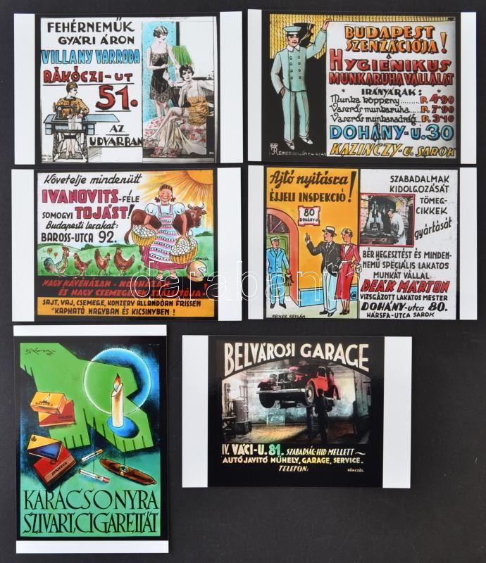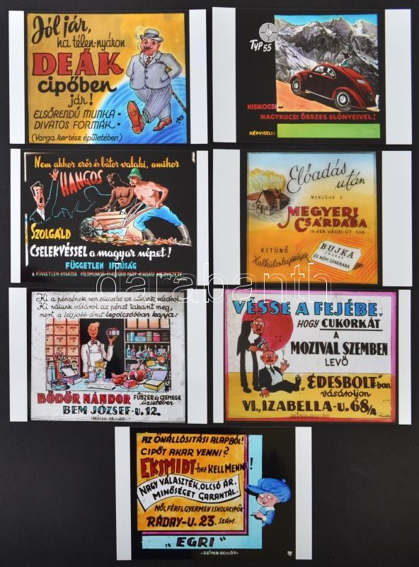 cca 1940 Árucikkek, szolgáltatások reklámja, 13 db modern nagyítás korabeli üveglemez diapozitívokról, amelyeket mozikban vetítettek a nagyfilmek előtt, Fekete György (1904-1990) budapesti fényképész hagyatékból, 10x15 cm