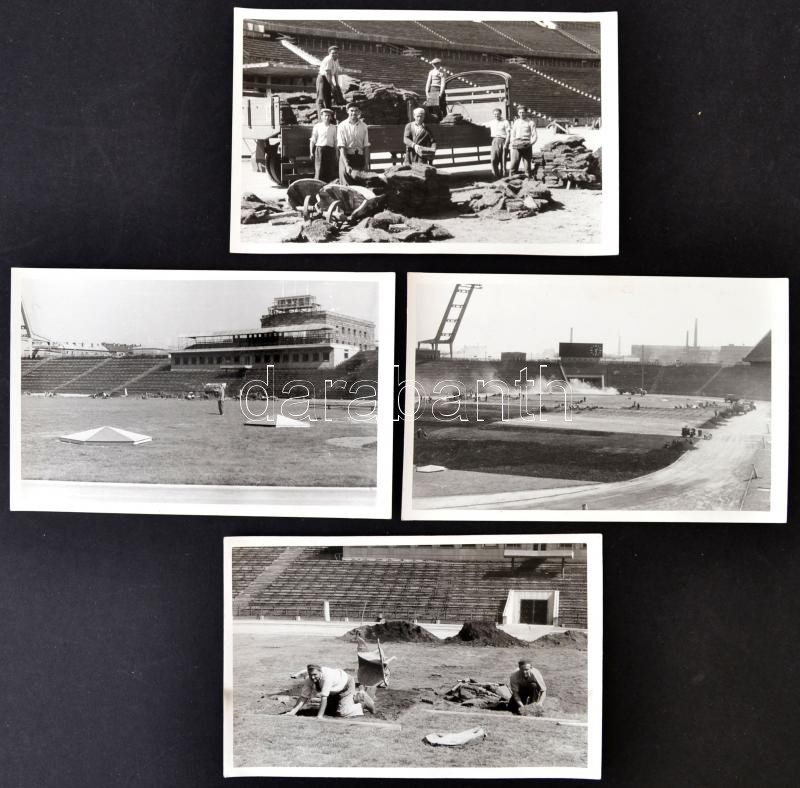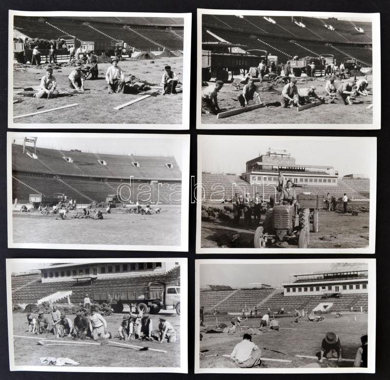 cca 1950 Az épülő Népstadion gyepének építési munkálatai. A végül 1953. augusztus 20-án átadott létesítmény füvesítését már az építkezés elején elkezdték, s közel három évig a legkorszerűbb szovjet tapasztalatok alapján végezték. 10 db fotó, 14x9 cm.