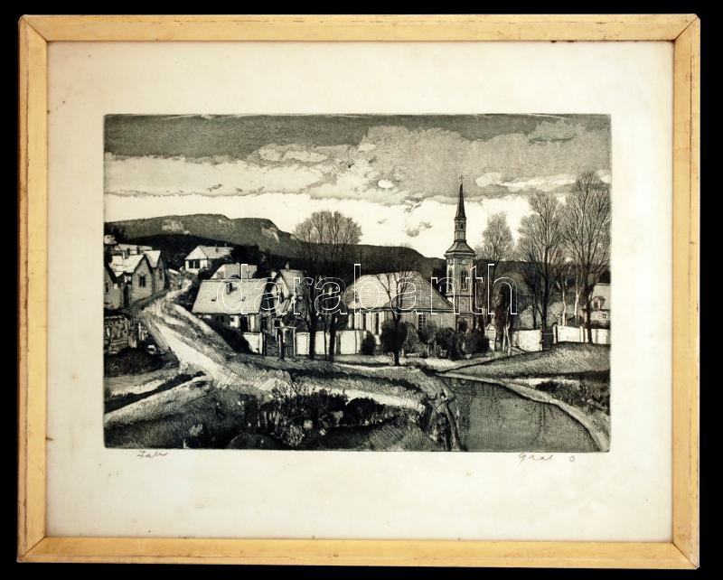 Gaál András (1936-): Falu, rézkarc, papír, üvegezett keretben, 26x38cm https://www.darabanth.com/de/264-Fernauktion/264.0/Andere-Sammelgebiete/Gemalde-und-Grafiken~1/Gaal-Andras-1936-Falu-rezkarc-papir-uvegezett-keretben-26x38cm~II1320534