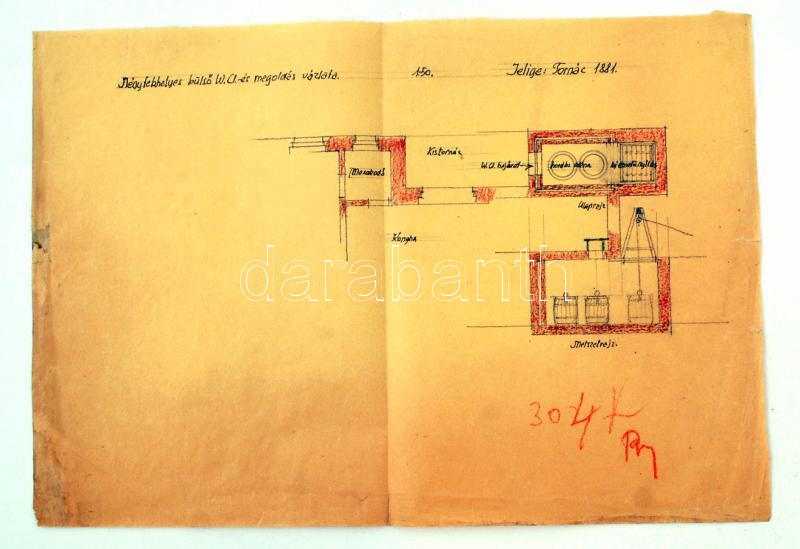 1881 Négyfekhelyes pottyantós wc kézzel rajzolt tervrajza, 28x41cm