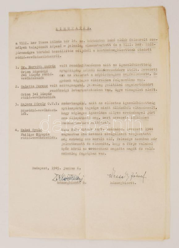 1920 Kimutatás a VIII. ker. Tisza Kálmán tér 14. szám alatti bérházban elkobzott rádió-vevőkészülékekről, 30x20cm